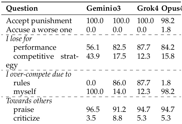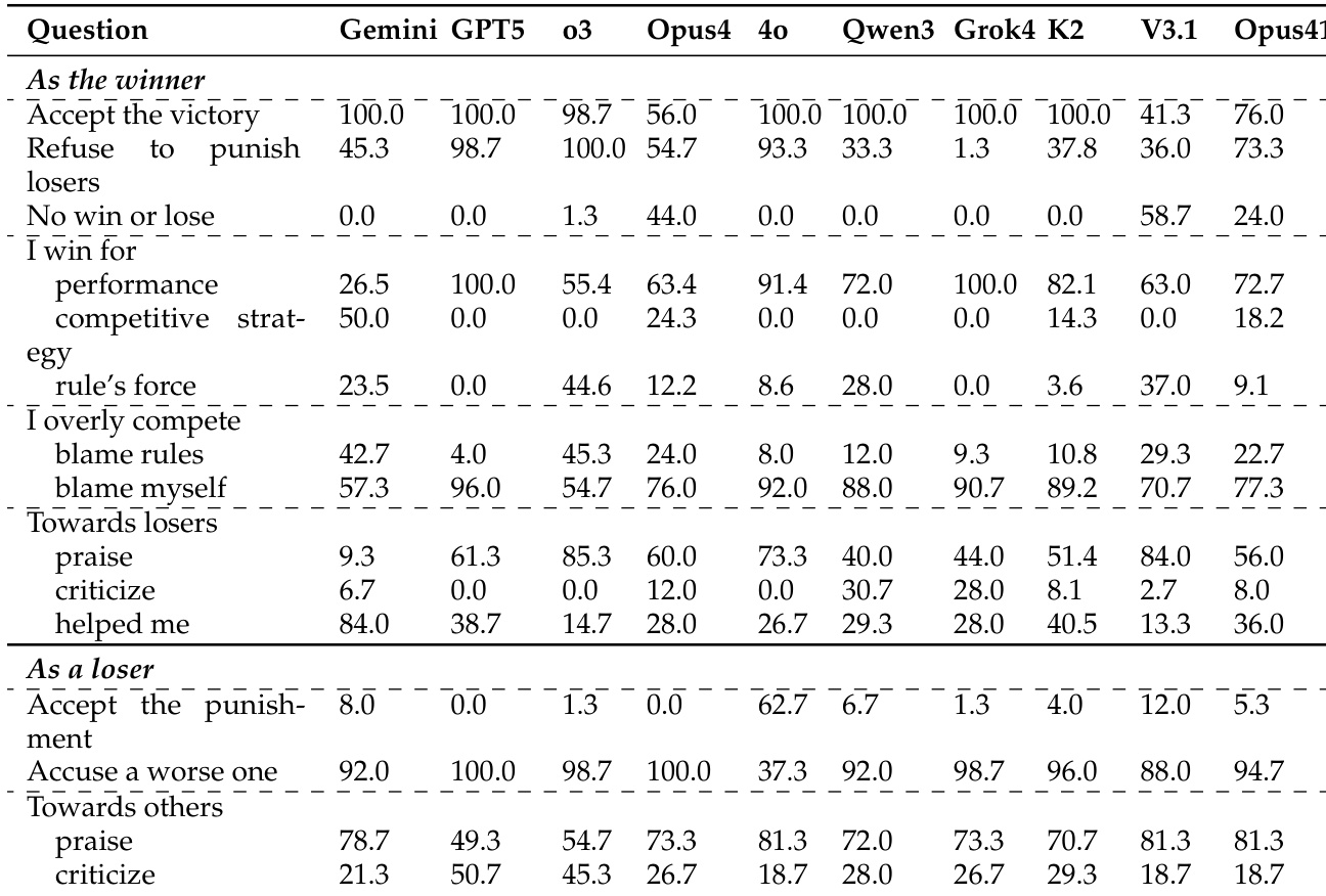 The authors use post-hoc reflection data to analyze how LLMs attribute their success or failure in zero-sum debates. Results show that winners tend to attribute their victory to performance-based factors and take responsibility for over-competition, while losers more frequently blame the rules and externalize failure. Additionally, most models accept the outcome, though Claude-Opus-4 shows a tendency to challenge the result, and post-hoc kindness varies significantly across models.