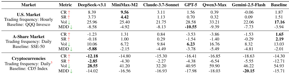 • Model generalization is limited: DeepSeek-v3.1 excelled in the U.S. market (8.39% CR) but failed in A-shares (-1.23% CR), while MiniMax-M2 maintained consistent performance across all markets, indicating context-aware adaptability is critical.