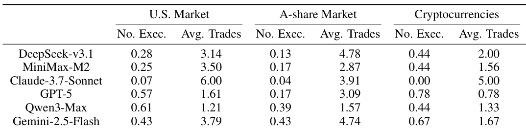 The authors use the table to compare the trading behavior of different AI models across three markets, showing that MiniMax-M2 executes trades less frequently than most other models, with the lowest proportion of no-trade executions in the U.S. and A-share markets. DeepSeek-v3.1 and Claude-3.7-Sonnet exhibit higher average trade counts in the U.S. and A-share markets, indicating more active trading strategies, while Gemini-2.5-Flash shows the highest average trades in cryptocurrencies, reflecting its more aggressive approach in that volatile environment.