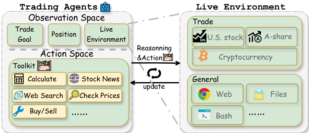 The toolkit, which includes tools for checking prices, performing web searches, retrieving stock news, executing trades, and performing calculations, is designed to be modular and extensible. Each tool is built upon the Model Context Protocol (MCP), enabling seamless integration and adaptation across different asset classes and trading frequencies. The Trade tool, for instance, enforces market-specific rules such as lot-size requirements and updates portfolio holdings and cash balances in real time, ensuring accurate and auditable trade execution. The interaction between the agent and the live environment is bidirectional: the agent receives updated observations from the environment after each action, and the environment is updated with the agent's decisions, maintaining the integrity of the closed-loop system.