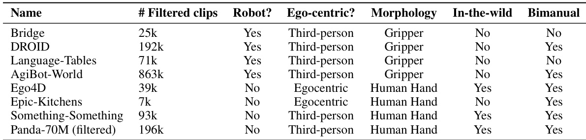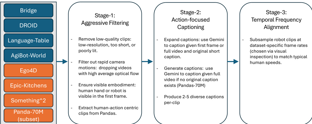 • Quality filtering removes low-resolution, poorly lit, or overly short/long clips. Additional filters ensure visible embodiment (hand or gripper) in the first frame via object detection, exclude failure trajectories in robot data, and remove videos with rapid camera motion.