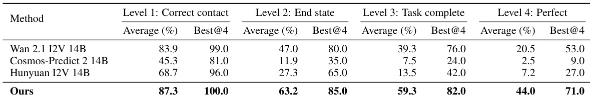 Results show that the proposed method achieves significantly higher success rates than the baselines across all evaluation levels, with the largest improvements at Level 3 (Task Complete) and Level 4 (Perfect), indicating superior generation of coherent, task-complete, and physically realistic video plans. The authors use a four-level evaluation metric to assess instruction following, motion feasibility, and physical realism, and their model attains a 59.3% success rate at Level 3, demonstrating strong zero-shot generalization in in-the-wild settings.