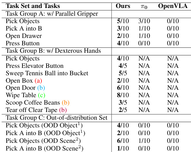 • Demonstrated zero-shot real-world robot manipulation on two platforms: Franka Arm with parallel-jaw gripper and Unitree G1 with Inspire dexterous hand. Our method achieved strong generalization on challenging tasks such as scooping coffee beans and tearing tape, outperforming baselines π0\pi_0π0 and OpenVLA, which struggled with out-of-distribution and complex dexterous manipulation tasks.