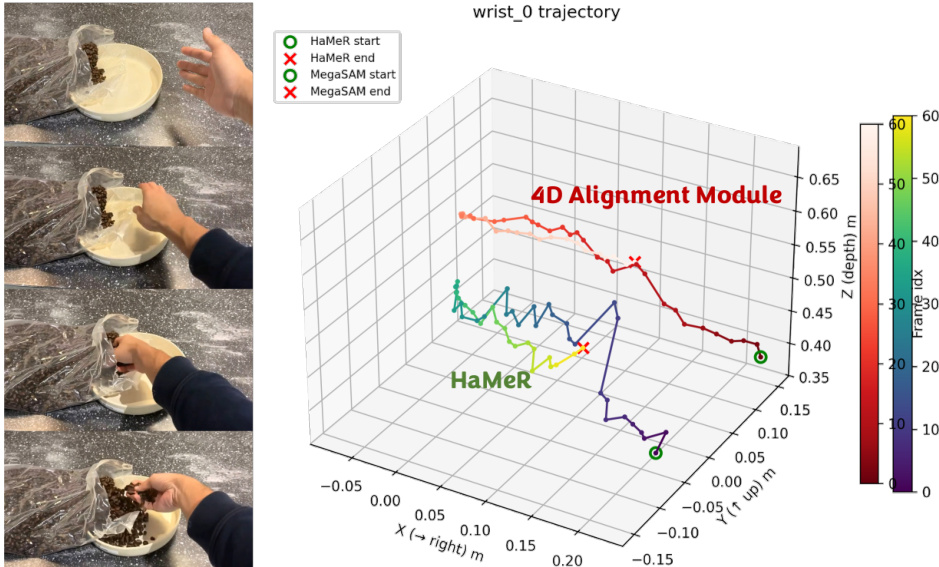 The action extraction pipeline converts the generated human hand video plans into executable robot actions. The process begins with human hand motion estimation, where a per-frame hand pose is predicted using the HaMeR model, which regresses MANO hand vertices and wrist orientation. However, due to monocular scale ambiguity and lack of temporal consistency, the predicted translations drift over time. To resolve this, a 4D reconstruction model, MegaSAM, is used to estimate per-frame depth maps and camera poses. The wrist position is then backprojected from the image plane into 3D using the depth and camera intrinsics, and the resulting pointclouds are used to estimate a temporally smooth translation, while the orientation from HaMeR is retained. This 4D alignment module significantly improves wrist localization robustness and temporal consistency.