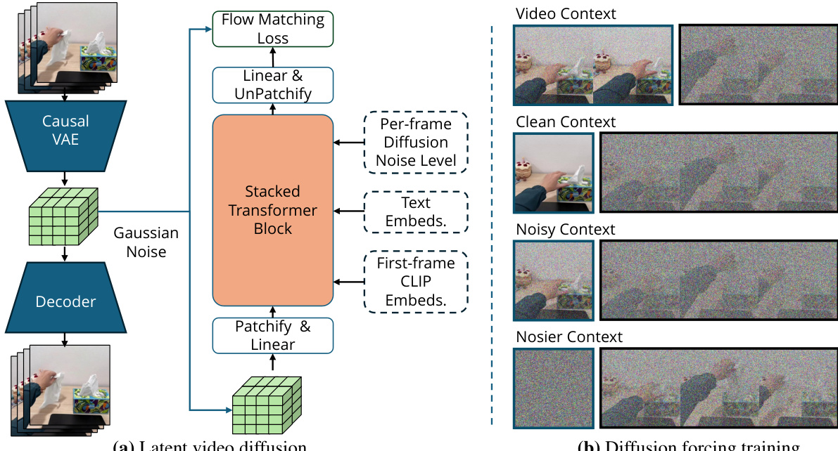 Refer to the framework diagram, which illustrates the complete pipeline. The diffusion transformer, a DiT variant, is trained with a modified Diffusion Forcing strategy to enable flexible conditioning on both image and video contexts. This approach allows the model to be conditioned on a clean first frame (image-to-video) or multiple history frames (video-to-video) by applying different noise levels to the context and future segments. During training, a random context length between 0 and 6 frames is selected, and independent noise levels are applied to the history and future segments. The history segment is set to zero noise with a 50% probability, enabling the model to learn to condition on clean or noisy context frames. This method eliminates the need for extra cross-attention mechanisms and is compatible with pre-trained model weights. The model is further enhanced with history guidance, a variant of classifier-free guidance, which combines the scores from conditional and unconditional sampling to improve adherence to both the text instruction and the context frames, resulting in more coherent and physically viable video plans.