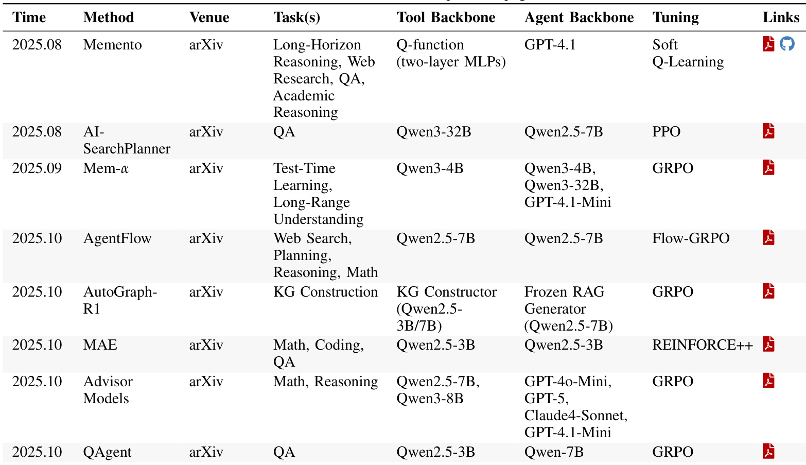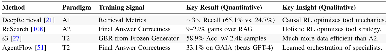 - The framework is supported by analysis of representative methods across domains, demonstrating that combining paradigms like T1 retrievers with A1 fine-tuning and T2 adaptive search agents enables more capable and efficient agentic systems.