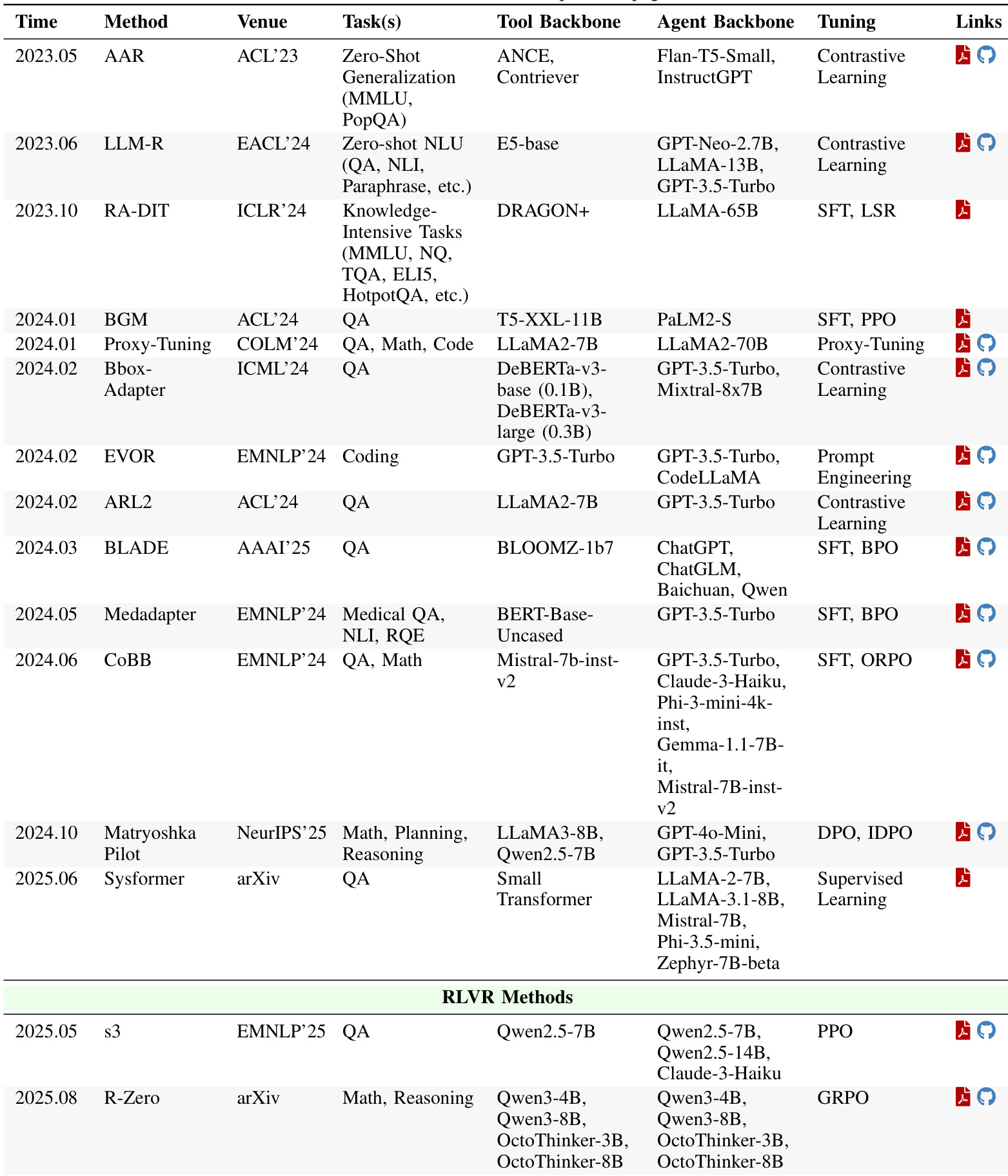 The authors use a table to compare earlier methods for tool execution signaling, highlighting their development timeline, tasks, tool and agent backbones, tuning techniques, and availability. Results show that these methods vary significantly in their backbone models, with some relying on large language models like GPT-3-175B and others using smaller models such as GPT-Neo-2.7B, and they employ different tuning strategies including proxy-tuning and contrastive learning.