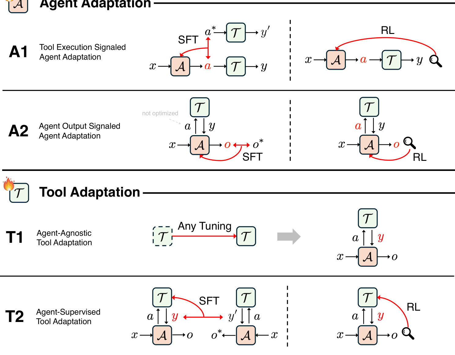 The paper presents a comprehensive framework for adapting agentic AI systems, categorizing adaptation approaches into four primary paradigms based on the optimization target and the source of the adaptation signal. This framework, illustrated in the conceptual diagram, divides the adaptation process into two main axes: agent-centric adaptation (A1, A2) and tool-centric adaptation (T1, T2). The core of the framework is the distinction between optimizing the agent's internal policy and optimizing the external tools that the agent interacts with.
