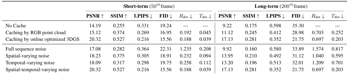 • Ablation confirmed 3DGS-based caching is critical for long-range fidelity (PSNR 17.13 vs 9.22 without cache) and spatial-temporal noise diffusion balances generation quality (PSNR 17.13) and camera accuracy (R_dist 0.697), outperforming spatial-only or temporal-only variants.