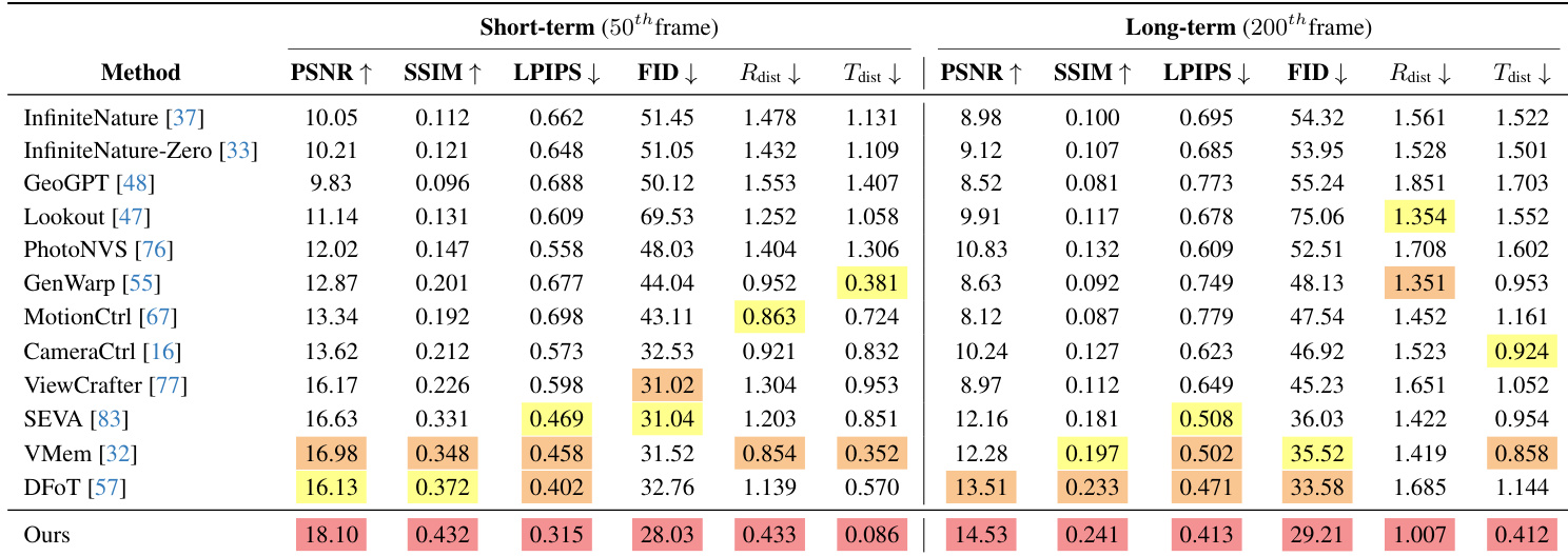 The authors evaluate their method on the RealEstate10K dataset, reporting superior performance across both short-term and long-term novel view synthesis metrics. Results show their approach achieves the highest PSNR and SSIM while maintaining the lowest LPIPS, FID, and camera pose errors (R_dist and T_dist), particularly excelling in long-term stability where most baselines degrade significantly. This demonstrates the effectiveness of their spatial-temporal noise diffusion strategy in preserving geometric consistency and mitigating cumulative camera drift.