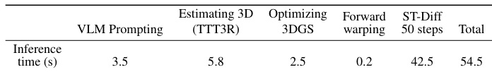The authors measure inference latency across pipeline components, showing that ST-Diff with 50 denoising steps dominates total time at 42.5 seconds, while 3D-related operations (TTT3R, 3DGS optimization, warping) collectively add only 8.5 seconds. Results confirm that geometric conditioning is computationally efficient compared to the generative backbone, which accounts for 78% of the total 54.5-second inference time per video chunk.