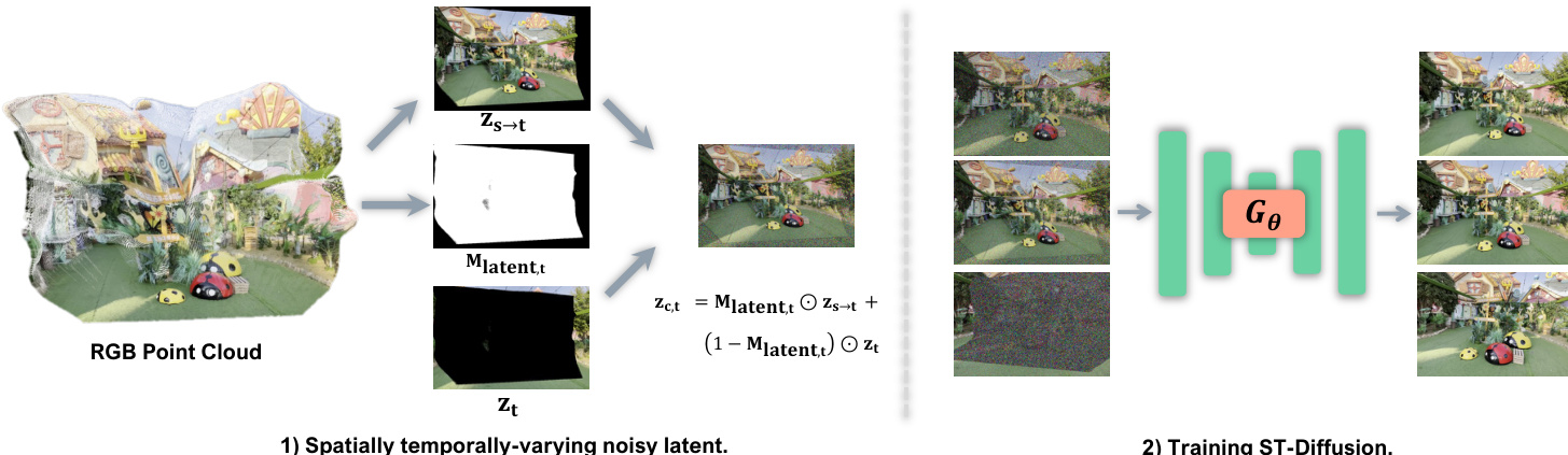 • The framework's core innovation is a Spatio-Temporal Diffusion (ST-Diff) model using a spatio-temporal varying noise schedule that applies full noise to blank regions for generation and partial noise to warped regions for refinement, enabling effective "fill-and-revise" of occlusions while leveraging bidirectional attention conditioned on forward-warped geometric priors.