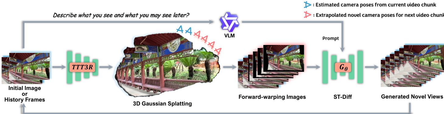 At the core of the inference pipeline is the online 3D geometric cache, initialized from either the starting image or the previously generated chunk. This cache is constructed by first estimating camera poses and an initial point cloud using TTT3R, followed by optimizing a 3D Gaussian Splatting (3DGS) representation over several hundred steps. This high-fidelity 3DGS model serves as a structural scaffold, enabling accurate forward-warping of the current history into novel viewpoints. Concurrently, a Vision-Language Model (VLM) generates a descriptive text prompt to guide semantic consistency, while novel camera poses for the next chunk are extrapolated using velocity-based linear translation and SLERP rotation interpolation.