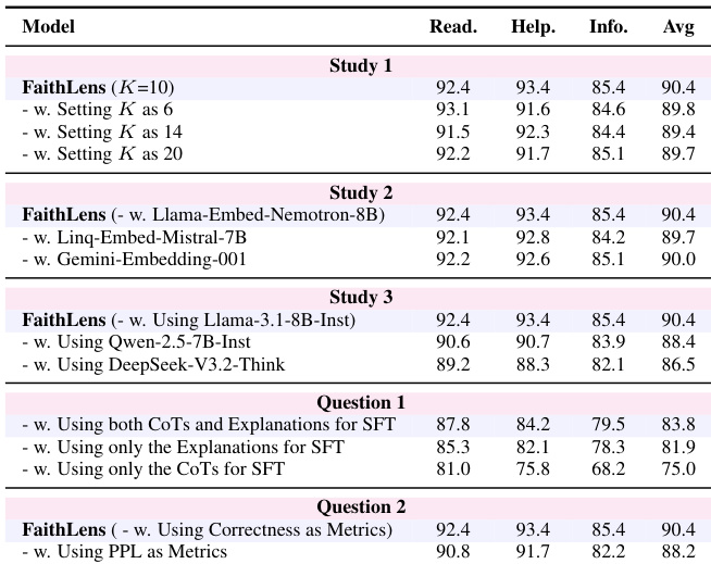 The authors evaluate FaithLens under various parameter settings and design variants, showing that performance remains stable across different cluster counts and embedding models. Using both CoTs and explanations during SFT yields significantly better results than using either component alone, and correctness-based rewards outperform perplexity-based metrics in RL. FaithLens consistently achieves high explainability scores, with minor drops only when using heterologous or expert-level models for reward computation.