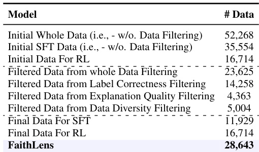 The authors use a multi-stage data filtering strategy to refine training data for FaithLens, progressively reducing the dataset from 52,268 initial samples to 28,643 final samples by applying label correctness, explanation quality, and data diversity filters. Results show that this filtering improves model performance while maintaining efficiency, as FaithLens achieves state-of-the-art results with lower inference cost and without relying on private data. The final training set includes 11,929 samples for SFT and 16,714 for RL, demonstrating the method’s ability to retain high-quality, diverse data for effective hallucination detection.