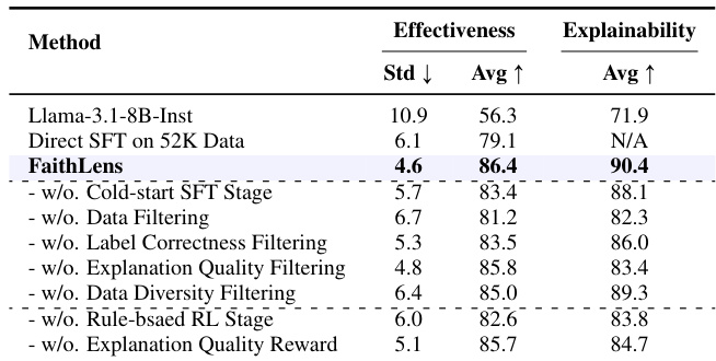 FaithLens achieves state-of-the-art effectiveness and explainability, outperforming baseline models with a macro-F1 of 86.4 and an explainability score of 90.4. Ablation results confirm that each component—cold-start SFT, data filtering, rule-based RL, and explanation quality reward—contributes meaningfully to performance, as removing any degrades either effectiveness or explainability. The model also demonstrates strong stability across tasks, with the lowest standard deviation (4.6) among compared methods.