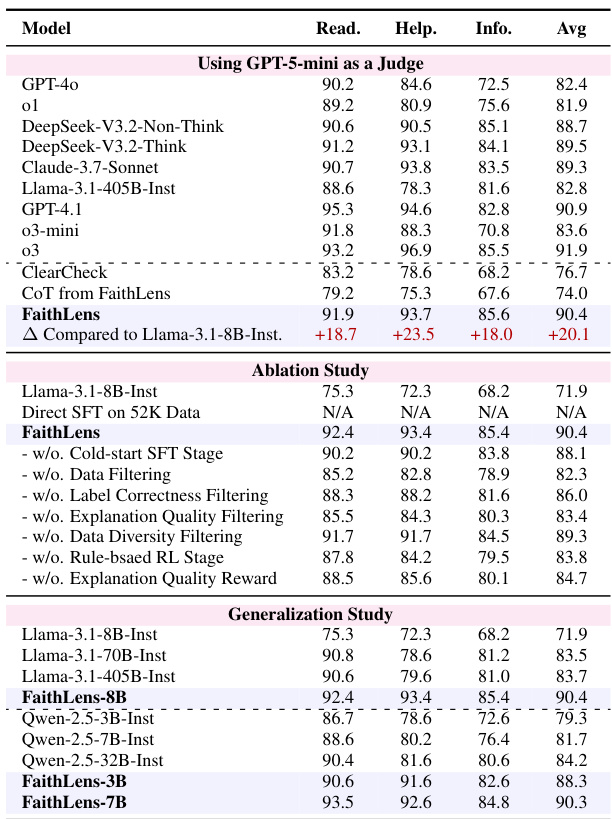 Results show that FaithLens outperforms both advanced LLMs and specialized detection models in explanation quality across readability, helpfulness, and informativeness when evaluated using GPT-5-mini as a judge, with gains of +18.7, +23.5, and +18.0 points respectively over the base Llama-3.1-8B-Inst model. Ablation studies confirm that each component—cold-start SFT, data filtering, and explanation quality reward—contributes meaningfully to performance, while generalization tests demonstrate consistent improvements across different foundation models including Qwen-2.5 series.