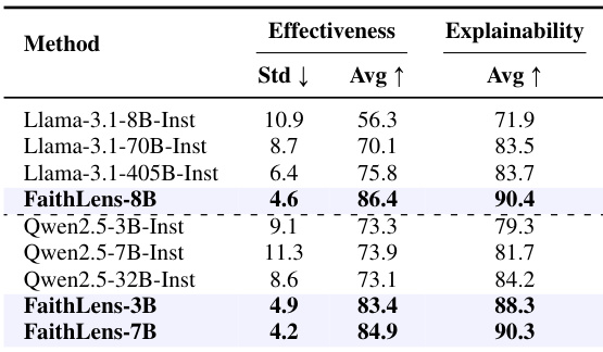 The authors use FaithLens to train detection models on Llama-3.1-8B-Inst, Qwen-2.5-3B-Inst, and Qwen-2.5-7B-Inst backbones, achieving state-of-the-art effectiveness and explainability scores across all variants. Results show FaithLens-8B attains the highest average effectiveness (86.4) and explainability (90.4) while reducing standard deviation to 4.6, indicating superior stability and performance. FaithLens-3B and FaithLens-7B also outperform their base models, confirming the method’s generalization across model sizes.