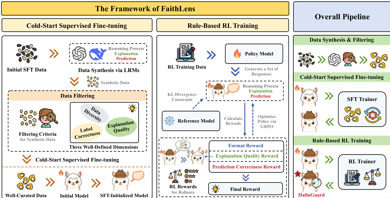 The authors leverage a two-stage training pipeline to build FaithLens, a specialized 8B-parameter model designed for joint faithfulness hallucination detection and explanation generation. The overall framework, as depicted in the figure below, begins with a cold-start supervised fine-tuning (SFT) phase using synthetically generated data, followed by a rule-based reinforcement learning (RL) stage to refine both prediction accuracy and explanation quality.