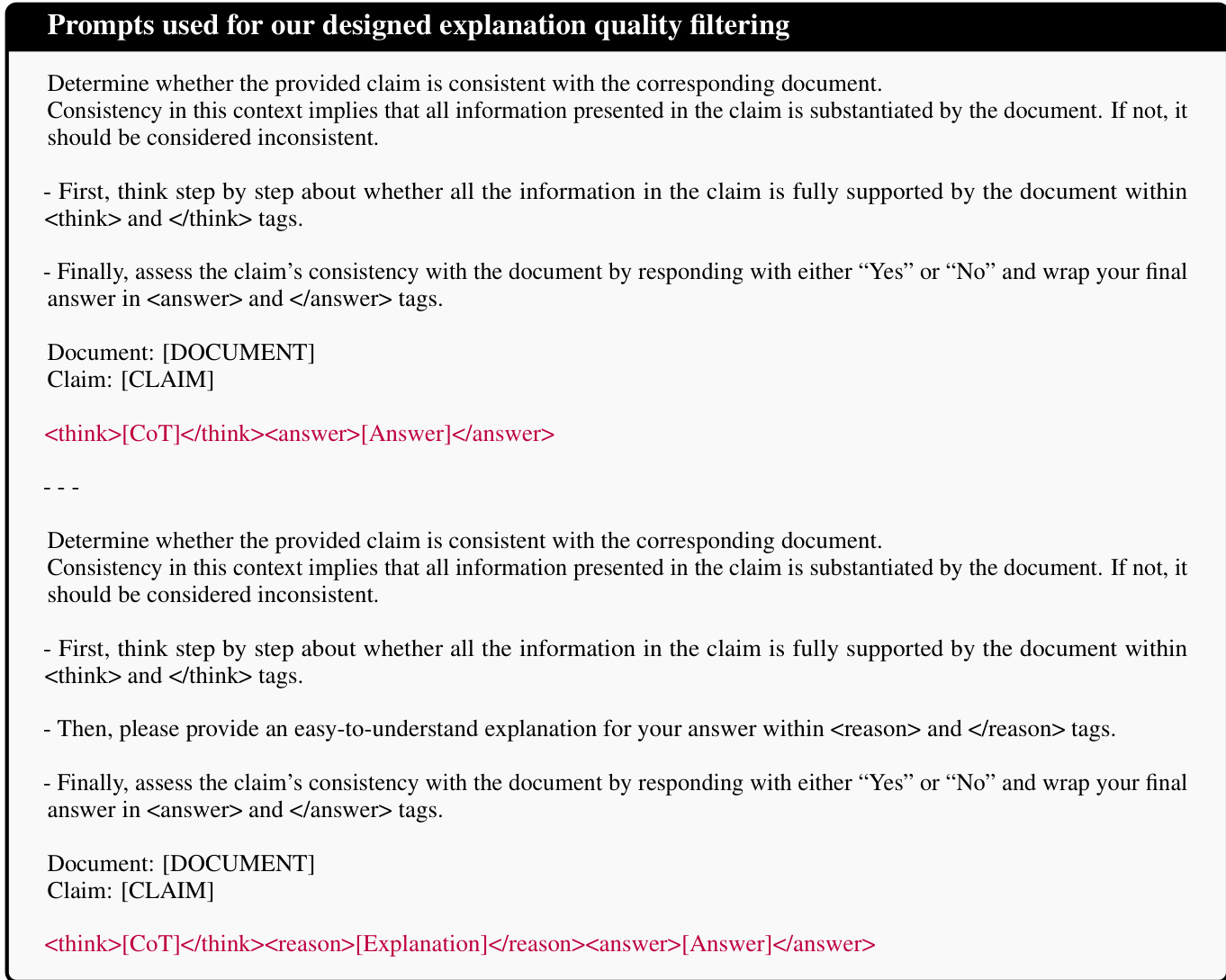 In the first stage, the authors synthesize training data by querying large language models (LLMs) with a structured prompt that enforces a specific output format: a chain-of-thought (CoT) reasoning trace, followed by a textual explanation, and finally a binary prediction. The prompt, shown in the figure below, instructs the LLM to first reason step-by-step within <tool_call> tags, then provide an explanation within <reason> tags, and conclude with a “Yes” or “No” answer wrapped in <answer> tags.