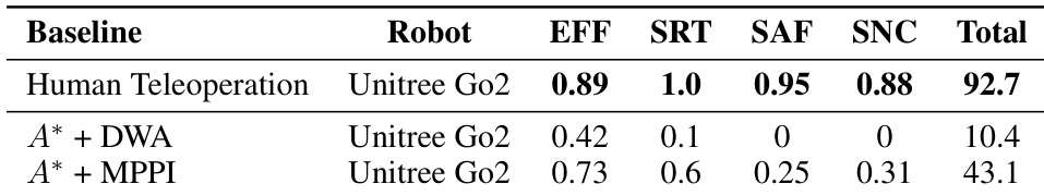 • Social navigation in dynamic crowds: Human teleoperation scored 92.7 total, while MPPI planner reached 43.1 and DWA failed (10.4), highlighting traditional planners’ lack of social cognition.