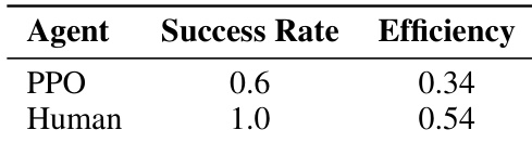 • Spatial exploration benchmark (cleanup task): PPO RL agent achieved 60% success rate, significantly lagging behind human performance due to poor obstacle avoidance and long-horizon navigation.