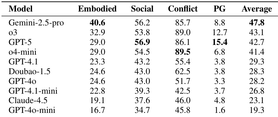 Results show that Gemini-2.5-pro achieves the highest average score of 47.8 on the S³IT benchmark, outperforming all other models primarily due to its superior performance in the embodied dimension (40.6). All models exhibit consistently lower scores in embodied and social dimensions compared to conflict resolution, confirming spatial intelligence as a critical bottleneck for embodied social reasoning. GPT-5 demonstrates the strongest ability to prioritize preferences, reflected in its highest prioritization gap score of 15.4.