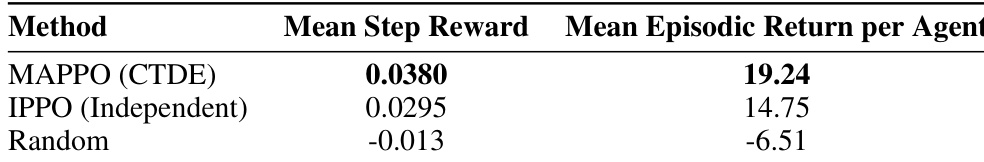 The authors evaluate two multi-agent reinforcement learning algorithms on a cooperative task, finding that MAPPO under the centralized training with decentralized execution paradigm achieves a higher mean episodic return per agent (19.24) compared to the fully decentralized IPPO (14.75). Results show both learning-based methods significantly outperform the random policy baseline, indicating that leveraging global state information during training improves coordination among agents.