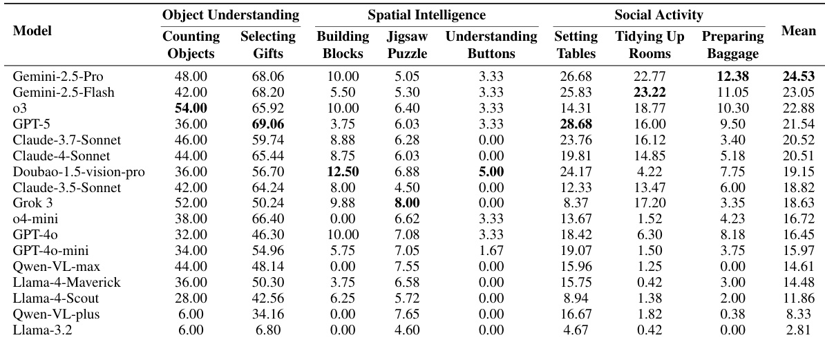 The authors evaluate 17 MLLMs on a composite embodied task benchmark spanning object understanding, spatial intelligence, and social activity domains. Results show that even the top-performing model, Gemini-2.5-Pro, achieves only a mean score of 24.53 out of 100, revealing a substantial gap in embodied reasoning capabilities. Spatial intelligence tasks, such as block building and puzzle solving, consistently yield the lowest scores across all models, highlighting a critical weakness in physical reasoning and manipulation planning.