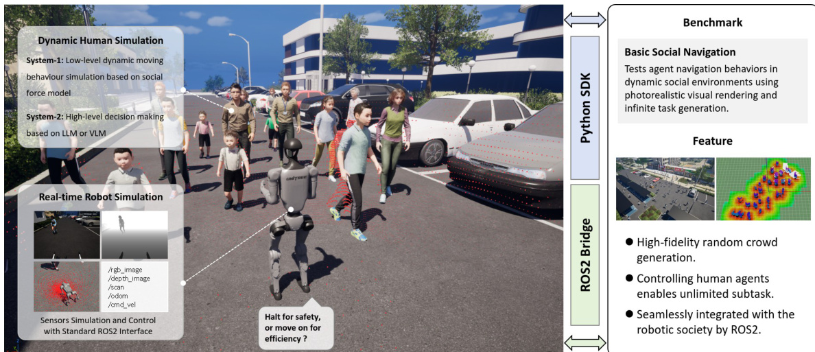 As shown in the figure below, the platform also supports real-time robot simulation with standard ROS2 interfaces, enabling seamless integration with robotic control stacks. This bridge facilitates testing in dynamic social environments, where agents must navigate photorealistic crowds and respond to safety-critical scenarios such as halting for pedestrians.