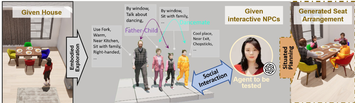 Finally, the platform enables situated planning tasks, such as social seating arrangement, where agents must synthesize environmental knowledge, NPC preferences, and spatial constraints to generate optimal configurations. This workflow, depicted in the figure below, illustrates how embodied exploration, social interaction modeling, and situated planning converge to evaluate high-level reasoning under real-world constraints.