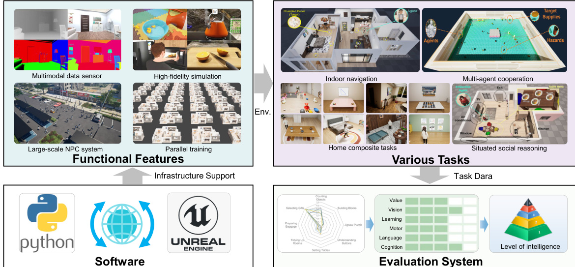 BIGAI researchers et al. propose TongSIM, a high-fidelity general-purpose embodied AI platform overcoming narrow task-specific simulators through 100+ multi-room indoor scenarios and an open-ended outdoor town. It enables unified training and evaluation of navigation, social simulation, and human-AI collaboration via customizable scenes and dynamic environmental fidelity, advancing scalable research toward general embodied intelligence.