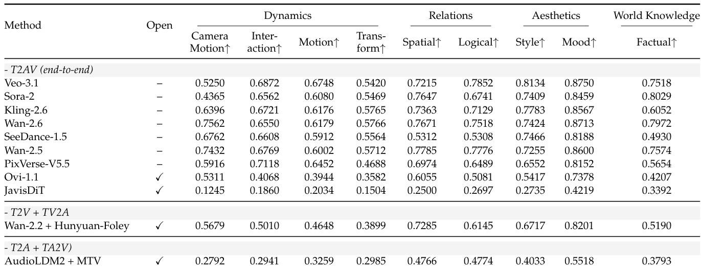The authors evaluate multiple text-to-audiovisual models across fine-grained instruction-following dimensions, revealing that end-to-end closed-source models like Veo-3.1 and Wan-2.5 consistently outperform open-source and composed systems in Dynamics, Relations, and World Knowledge. Composed pipelines such as Wan-2.2 + HunyuanFoley show competitive performance in specific areas like Aesthetics and Relations, but generally lag in temporal and interactional coherence. Open-source models including Ovi-1.1 and JavisDiT exhibit significantly lower scores across nearly all dimensions, particularly in Motion and Transform, indicating persistent challenges in handling complex temporal and structural instructions.