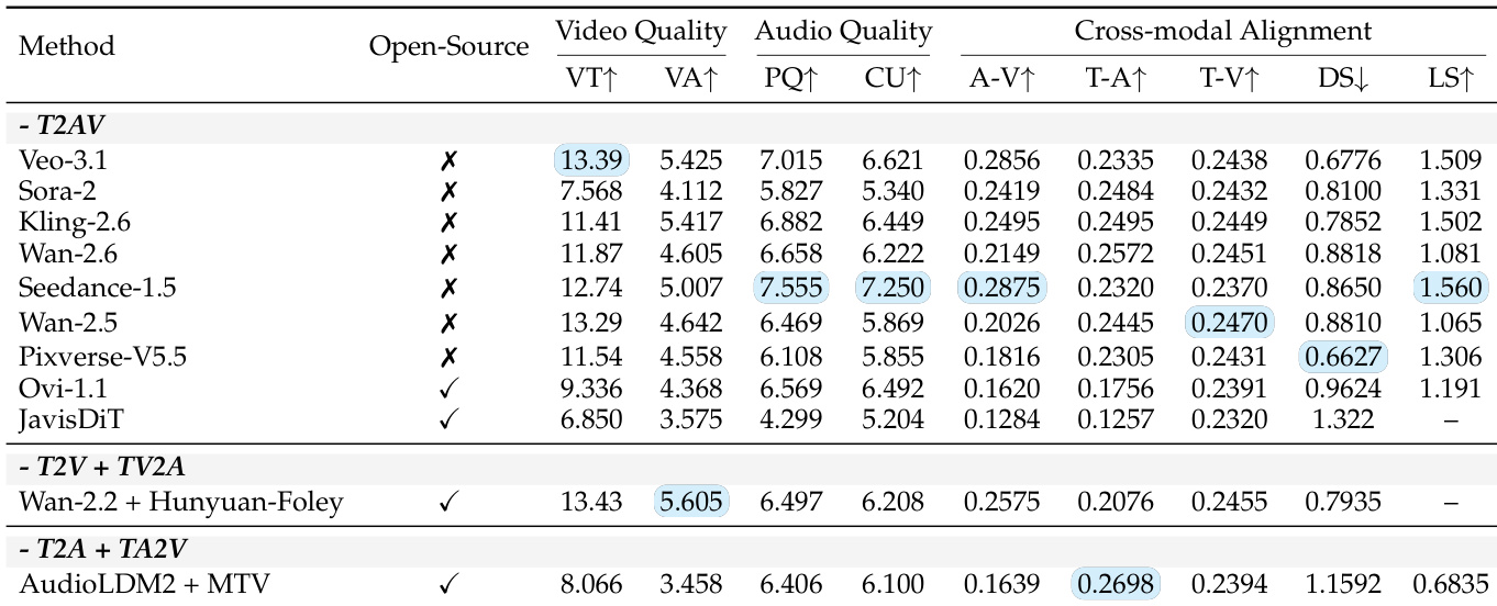 The authors use objective metrics to evaluate 11 T2AV systems across video quality, audio quality, and cross-modal alignment, revealing that closed-source models generally outperform open-source ones. Results show Veo-3.1 leads in video technical quality (VT) and cross-modal alignment (T-V), while composed pipelines like Wan-2.2 + Hunyuan-Foley achieve the highest video aesthetic score (VA). Audio quality remains a bottleneck, with even top models scoring modestly on perceptual quality (PQ) and content usefulness (CU), and synchronization metrics (DS, LS) vary widely across systems.