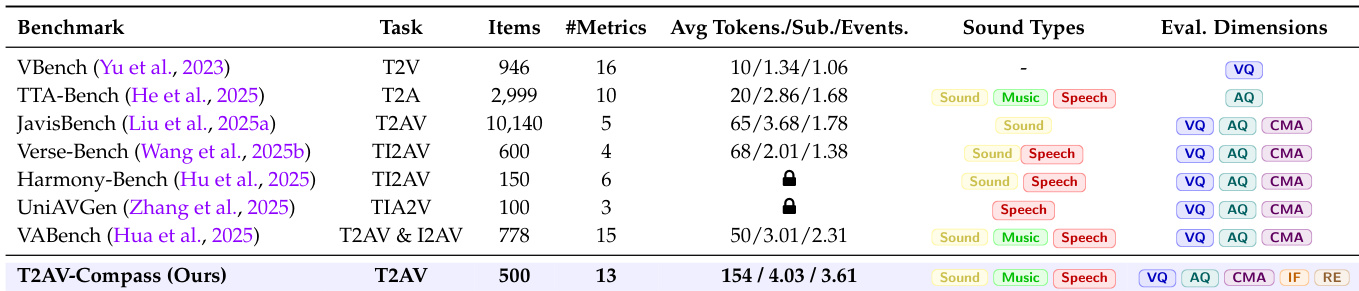 The authors use T2AV-Compass to evaluate text-to-audiovisual generation systems across 13 metrics, covering video quality, audio quality, cross-modal alignment, instruction following, and realism, with an average of 154 tokens per sample and support for sound, music, and speech. Results show T2AV-Compass includes more diverse evaluation dimensions than prior benchmarks while maintaining a moderate scale of 500 items, enabling comprehensive yet tractable assessment of multimodal coherence and perceptual fidelity.