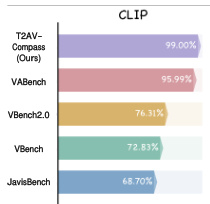 The authors use CLIP-based alignment scores to evaluate cross-modal consistency in text-to-audiovisual generation, with T2AV-Compass achieving the highest score at 99.00%. Results show that T2AV-Compass significantly outperforms prior benchmarks including VABench, VBench2.0, and JavisBench, indicating stronger semantic alignment between generated content and input prompts.