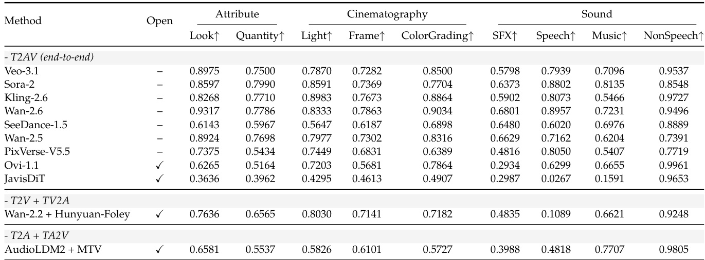 The authors evaluate multiple T2AV systems across visual and auditory dimensions using objective metrics, revealing that closed-source models generally outperform open-source ones in attribute and cinematography scores, while composed pipelines like Wan-2.2 + HunyuanFoley show competitive performance in specific areas such as non-speech audio fidelity. Results indicate a consistent gap in audio realism across all models, with speech and music scores notably lower than visual metrics, highlighting a persistent cross-modal bottleneck. Veo-3.1 leads in most visual categories but underperforms in sound-related metrics, underscoring the challenge of achieving balanced multimodal generation.