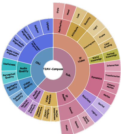 The authors leverage a dual-level evaluation framework for text-to-audio-video (T2AV) generation, designed to systematically assess both objective fidelity and subjective semantic alignment. At the core of this framework is T2AV-Compass, a unified benchmark that decomposes evaluation into two complementary tiers: objective metrics and reasoning-driven subjective judgment.