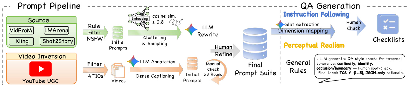The subjective evaluation layer employs an MLLM-as-a-Judge protocol that mandates explicit reasoning before scoring. This protocol operates along two tracks: Instruction Following (IF), which verifies prompt adherence via granular QA checklists derived from the input prompt, and Perceptual Realism (PR), which diagnoses physical and perceptual violations independent of the prompt. The QA generation pipeline begins with prompt sourcing from models like VidProM or LMArena, followed by filtering, LLM rewriting, and human refinement to produce a final prompt suite. From this suite, automated QA checklists are generated per dimension—such as Look, Quantity, Motion, or Sound Effects—using slot extraction and dimension mapping, with human validation ensuring fidelity. The realism track further incorporates temporal coherence checks (TCS) and material-timbre consistency (MTC) to evaluate physical plausibility.