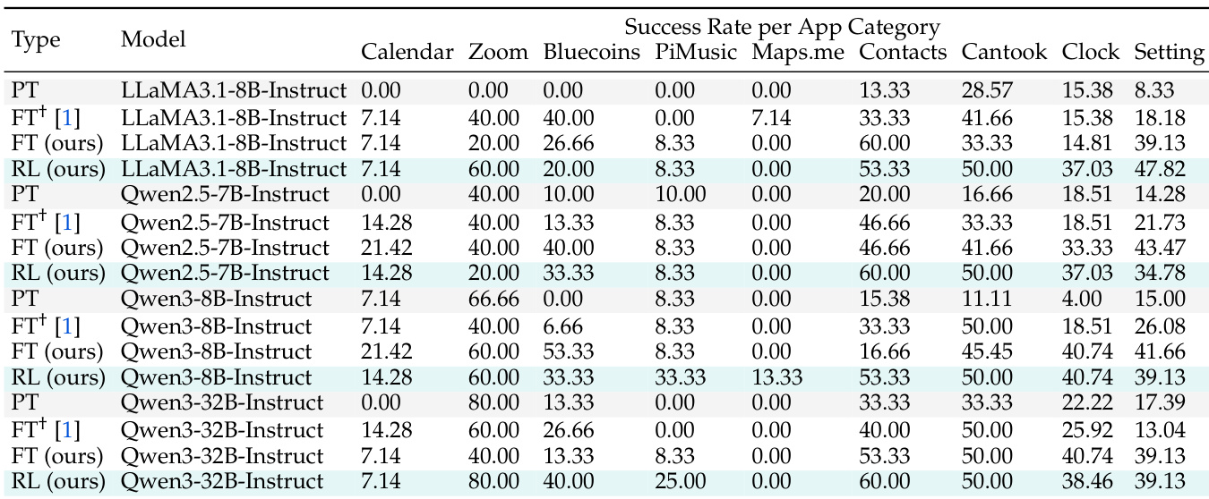 • All models under investigation show performance gains exceeding 16% over vanilla prompting and fine-tuning, with consistent improvements across most app categories except Maps.me, where a knowledge gap limits progress.