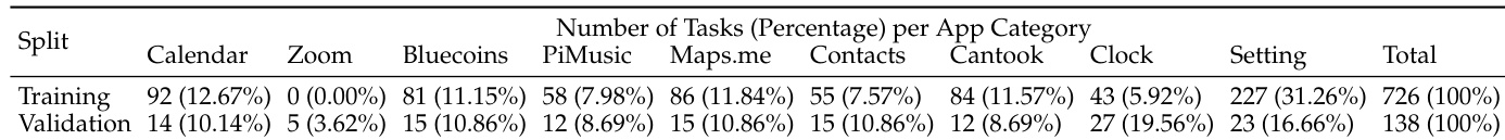 The authors analyze the distribution of tasks across app categories in the AndroidLab benchmark, showing that the training set is heavily dominated by tasks from the Settings app (31.26%), while the Validation set includes a more balanced distribution with notable representation from Calendar, Bluecoins, and Contacts. This imbalance suggests that model performance may be particularly influenced by the overrepresentation of certain app domains in the training data.