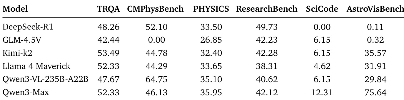 The authors use the table to evaluate large language models across six scientific benchmarks, including TRQA, CMPHysBench, PHYSICS, ResearchBench, SciCode, and AstroVisBench. Results show that Qwen3-Max achieves the highest score on AstroVisBench and performs competitively across other benchmarks, while DeepSeek-R1 and GLM-4.5V show lower performance, particularly on SciCode and AstroVisBench.