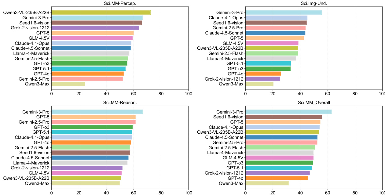 • Scientific Multimodal Reasoning showed the highest variance among models, serving as the strongest discriminative signal, while perception tasks were more saturated and less indicative of advanced scientific intelligence.