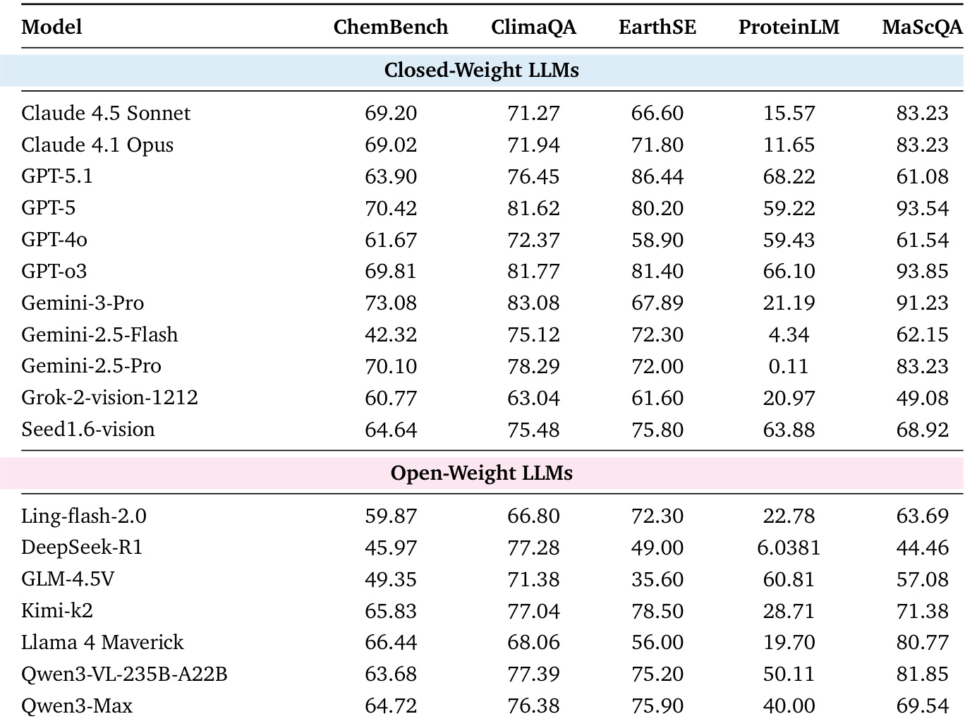 The authors use a capability-oriented evaluation framework to assess large language models across scientific text and multimodal tasks, with results showing that models achieve high scores in Scientific Knowledge Understanding but struggle with Scientific Code Generation and Symbolic Reasoning. The table reveals that Gemini-3-Pro and GPT-5 lead in most benchmarks, while open-weight models like Qwen3-Max and Qwen3-VL-235B-A22B show competitive performance, particularly in code generation and multimodal perception, though they lag in deeper reasoning tasks.