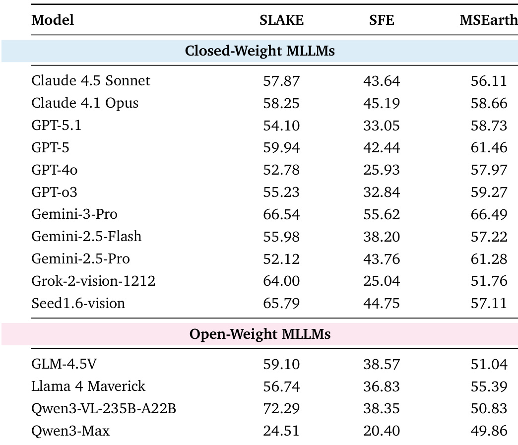 The authors use the table to evaluate multimodal language models on three scientific benchmarks: SLAKE, SFE, and MSearth, focusing on visual reasoning, code-based visualization, and entity localization. Results show that Qwen3-VL-235B-A22B achieves the highest score on SLAKE, while Gemini-3-Pro leads on SFE and MSearth, indicating strong performance across different multimodal tasks. Among open-weight models, Qwen3-VL-235B-A22B outperforms others on SLAKE, but Qwen3-Max shows significantly lower scores across all benchmarks, highlighting a performance gap between models specialized in visual perception and those focused on text-based reasoning.