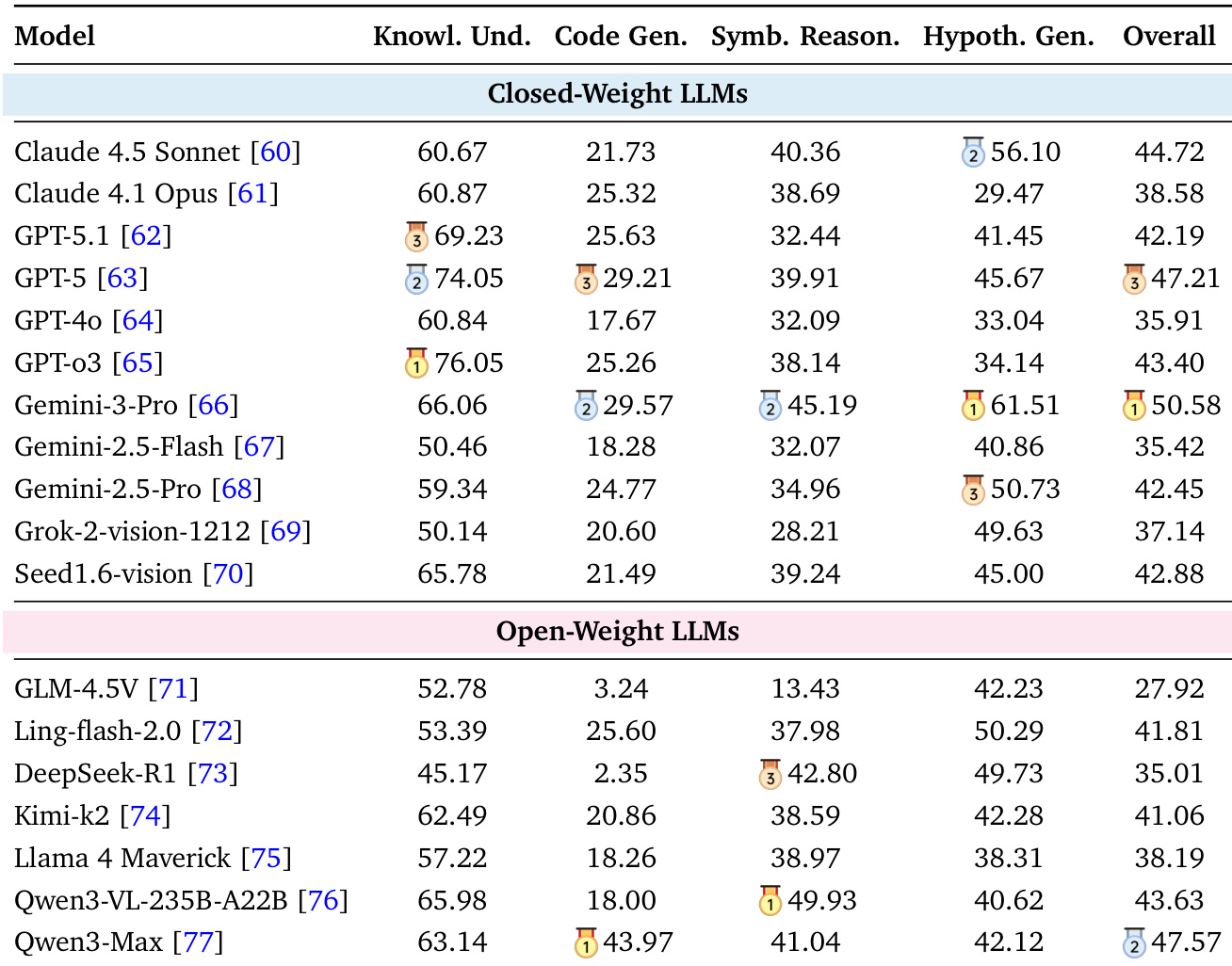 • On Scientific Knowledge Understanding, top models (Gemini-3-Pro, GPT-o3, GPT-5) achieved high scores (up to 76.05), indicating strong factual recall and concept comprehension, but performance in Code Generation and Symbolic Reasoning remained low (e.g., Gemini-3-Pro: 29.57, Qwen3-Max: 43.97), revealing a persistent gap in executable and formal reasoning.