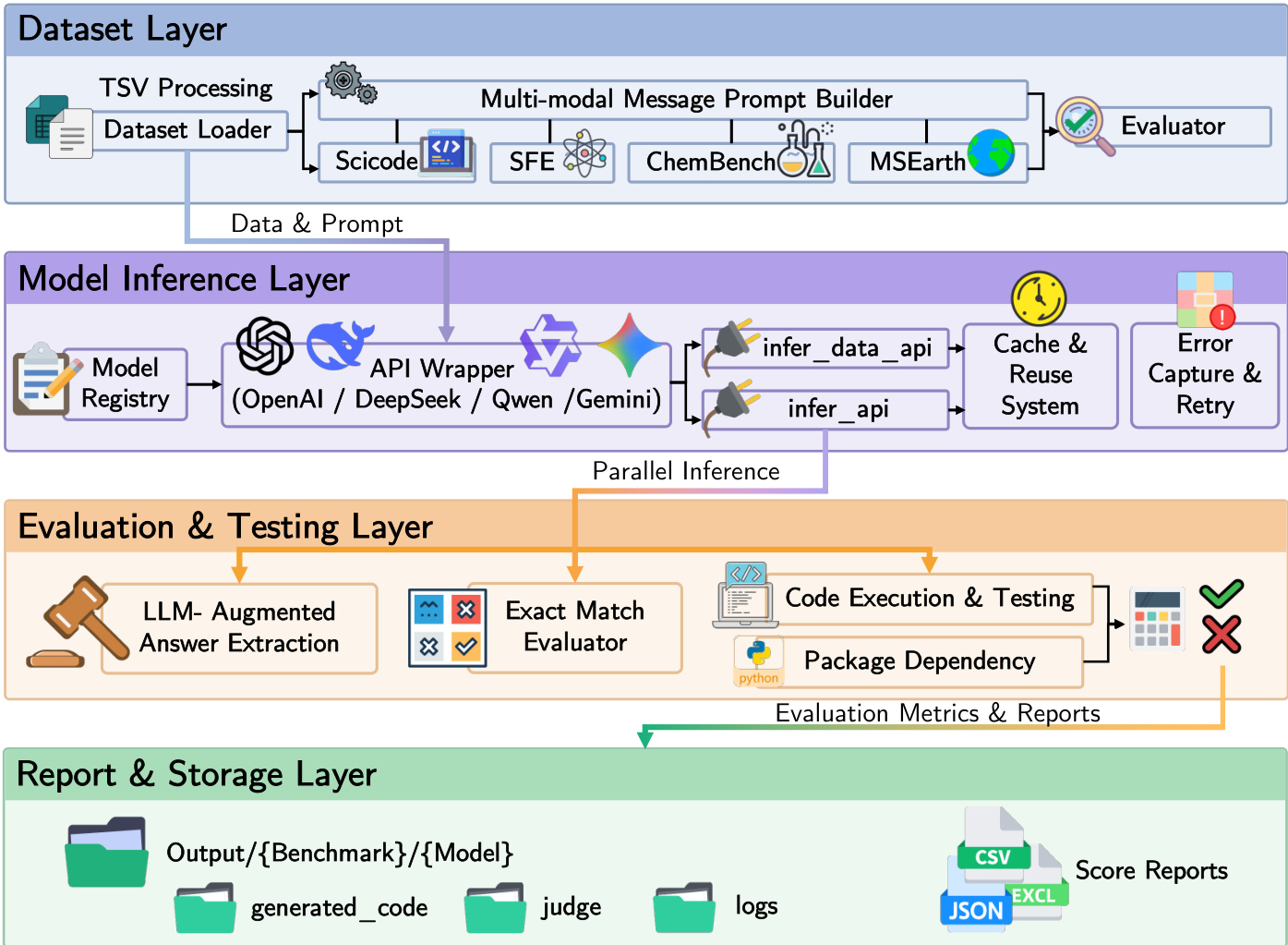 The Evaluation & Testing Layer processes the model predictions generated by the inference layer. It performs capability-aligned scoring through a combination of deterministic and LLM-augmented evaluation paths. The framework provides multiple evaluation utilities, including exact matching, semantic retrieval, numerical scoring, and code execution. For code-execution tasks, such as those involving scientific programming, the framework invokes sandboxed Python environments to verify the computational correctness and visual output fidelity of the generated code. The evaluate() function, which is standardized across all datasets, applies the appropriate scoring method based on the task type. This layer also includes a build_judge() function for LLM-based judging, which provides a flexible mechanism for evaluating complex or open-ended responses. The evaluation pipeline is designed to be modular, allowing researchers to incorporate new datasets or evaluation strategies without modifying the core inference or scoring logic.