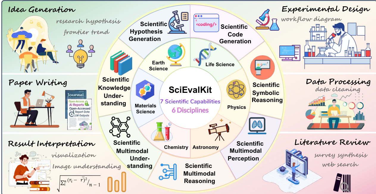 The authors leverage SciEvalKit, an open-source evaluation toolkit, to address the growing need for rigorous, domain-specific assessment of scientific intelligence in large language and multimodal models. Current benchmarks fall short by focusing on narrow, surface-level tasks—such as factual recall or generic image captioning—while failing to capture the complex, multi-representational reasoning required in real scientific workflows, including symbolic manipulation, code generation, hypothesis formation, and multimodal understanding of scientific data. This gap is especially evident in models that perform well on general tasks but underperform on expert-level scientific challenges, revealing a critical disconnect between broad capabilities and domain-specific expertise. The main contribution is a unified, extensible evaluation framework that integrates 15 expert-curated benchmarks across six scientific disciplines, organized around a seven-dimensional taxonomy of scientific intelligence grounded in cognitive theory. By supporting execution-aware scoring, multimodal inputs, and transparent, reproducible evaluation, SciEvalKit enables capability-oriented assessment that reveals fundamental shortcomings in current models—particularly in symbolic reasoning and visual grounding—while providing a standardized, community-driven platform for advancing AI in science.