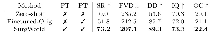 • Demonstrated effective few-shot adaptation on 5 real surgical trajectories, where SurgWorld pretrained on SATA achieved a 73.2% task success rate and lowest FVD, significantly outperforming direct finetuning from the original model, highlighting improved data efficiency and robustness.