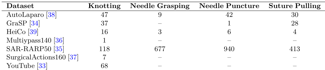 The authors use the table to show the distribution of video clips across different surgical actions in the SATA dataset, highlighting that the dataset is heavily skewed toward certain procedures like Needle Grasping and Suture Pulling. This imbalance reflects the focus on specific surgical tasks in the data collection process, with some actions such as Knotting and Needle Puncture being less represented.